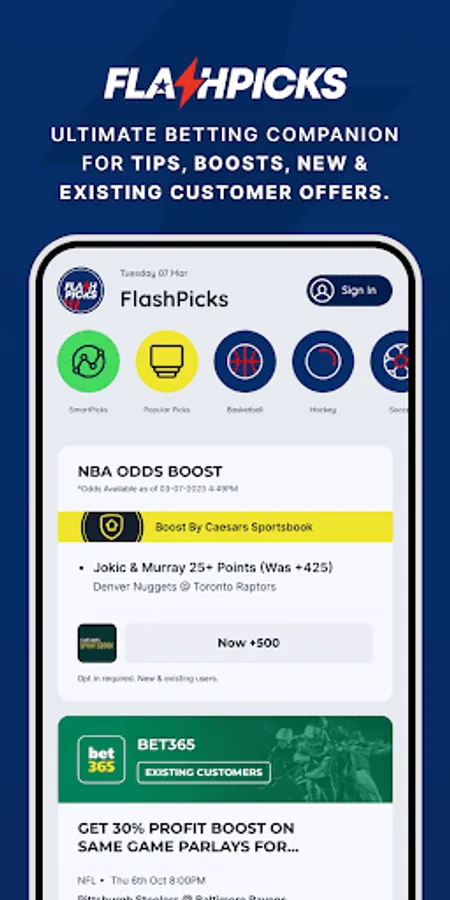 Get the latest sports news, win/loss records, game scores & points totals; Watching is never as fun when you don't have skin in the game! Bet with us, and you'll also get exclusive deals and new user promos, boosts offers from the top premium sportsbook operators in the US - for all states where sports betting is legal. We’ve got all the stats, odds, experts and facts you need about games, players and teams, so that you can find and place your bets quickly and easily in this ultimate sports betting app. The FlashPicks Sports Betting App for your phone, is your best bet for US sports betting tips, odds, stats and parlays! Bet on for football, baseball, hockey, basketball and soccer.