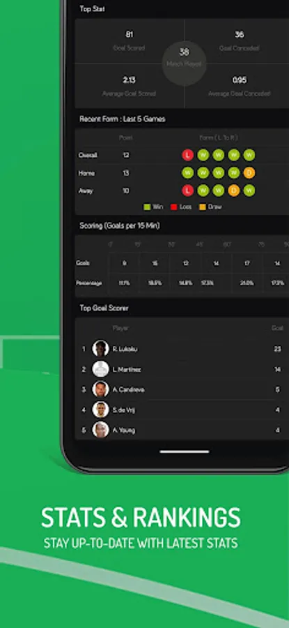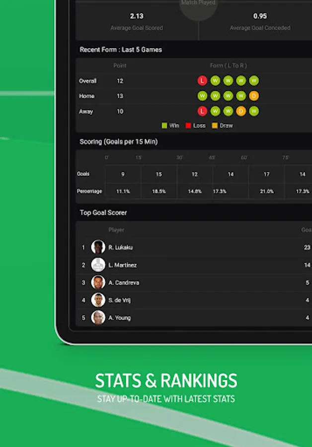 - Statistics: Including Standings, Head to Head , Top Scorers, Top Assists and Cards.