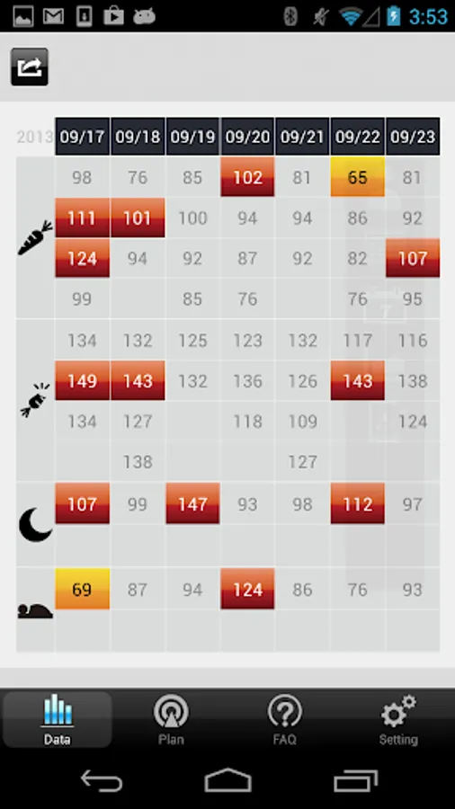 Blood glucose management at a glance! Data is displayed in a weekly format, for AC, PC, night and sleep, with the color coding system making it much easier to see the usual ups and downs of blood glucose level during the week.