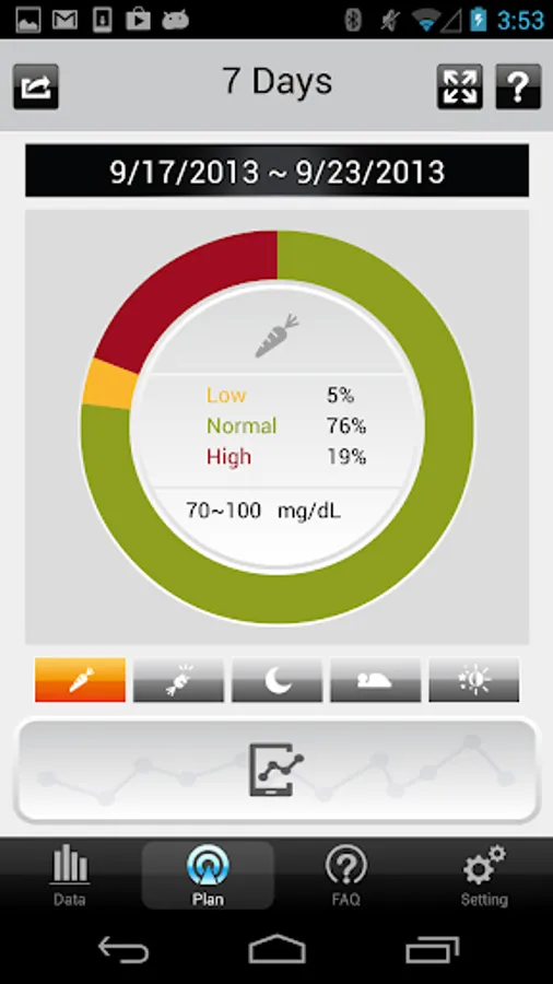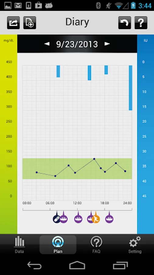 See instantly how insulin dosage, medication, activities and food intake impact your blood glucose levels. The graphs are displayed in a scale of 24-hour period, from midnight to midnight.