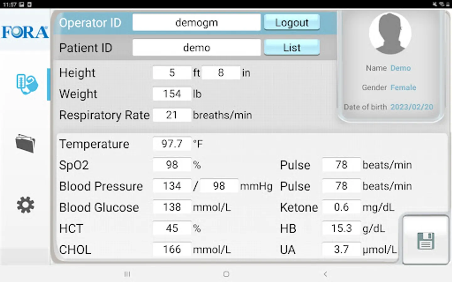 iFORA CS works with ForaCare’s Mobile Care Station to provide caregivers an easy-to-use and affordable solution for ward rounds in hospital. The application records patients’ blood glucose, blood pressure, body temperature, and SpO2 readings, and presents them via a comprehensive user interface to facilitate management of patients’ health data. During each measurement, the result is transmitted via Bluetooth to the application instantly, which makes review of readings from different meter types much easier and saves time for handwriting.