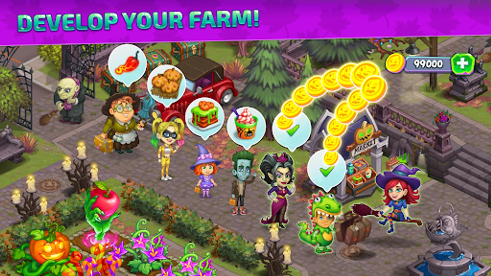 Create your own fairy Halloween farm: harvest magic plants, feed animals, trade with friends, craft sweets and costumes, renovate the house, build a Carnival fair. Evolve a big farm in spooky mansion from abandoned township!