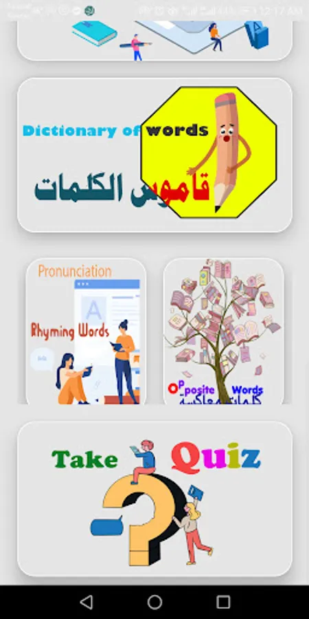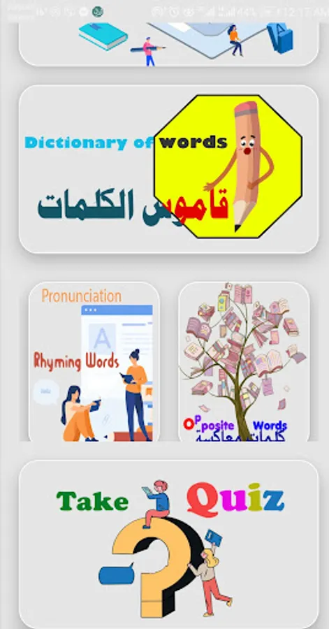 هناك بعض الكلمات المتشابهة من حيث القراءة وأيضًا بعض الكلمات المعاكسة للمستخدمين وأخيرًا يمكنك إجراء اختبارات قصيرة حول الموضوعات التي امتحن عليها ، وإن شاء الله في المستقبل القريب سنطور أكثر ونقدمها إلى مستوى جيد قم بتنزيل تطبيقنا والاستفادة منه.