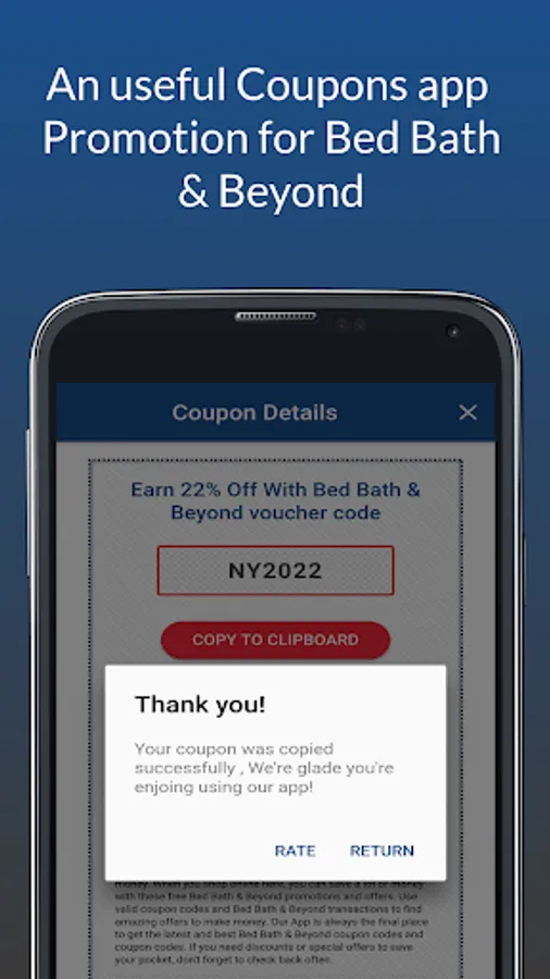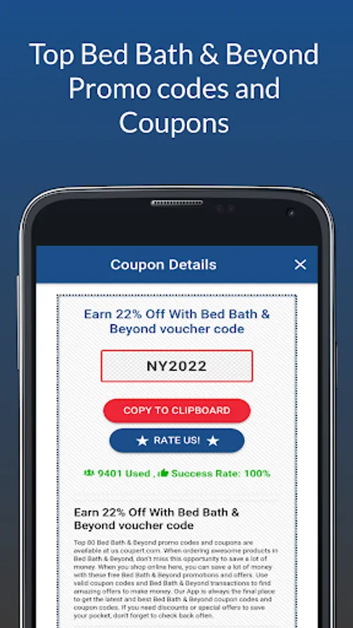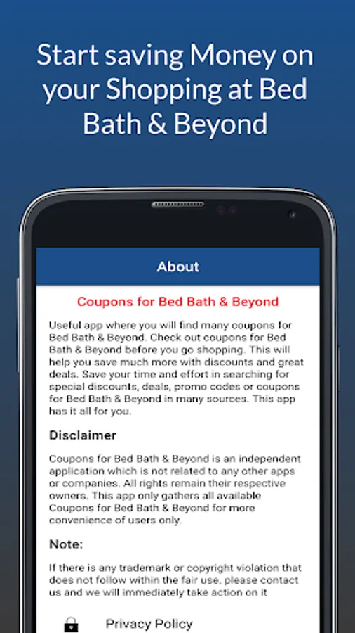 Coupons for bed bath & beyond is an independent application which is not related to any other apps or companies. All rights remain their respective owners. This app only gathers all available Coupons for bed bath & beyond for more convenience of users only.