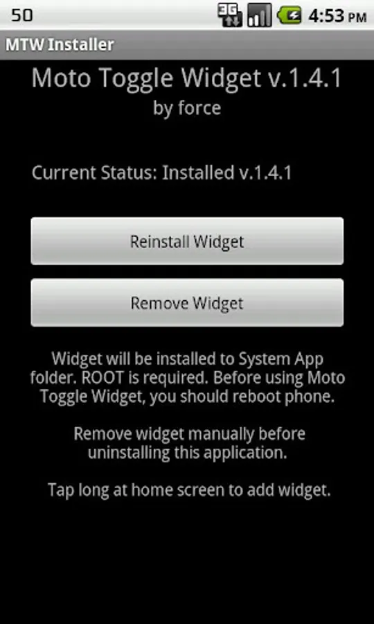 Program consists in three parts: main widget, system module for data management and it installer. Run MTW installer, press install and reboot your phone, before using (widget can be found with long tap at main screen). Uninstall system module before removing program (or widget will remain at phone)!