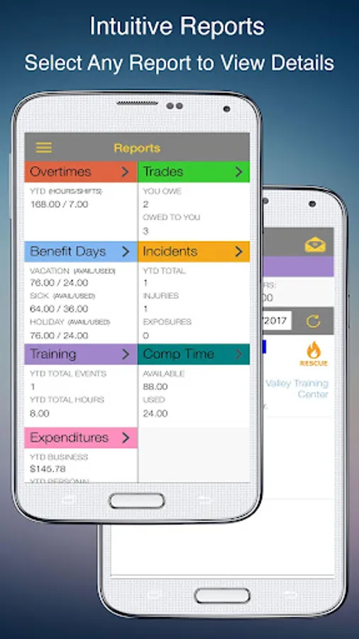 2. Sleek reports that give you the info you need at a mere glance. View your shift trades, overtimes, comp time, benefits accrued or used, training and fire incidents with ease. You can also email your reports.