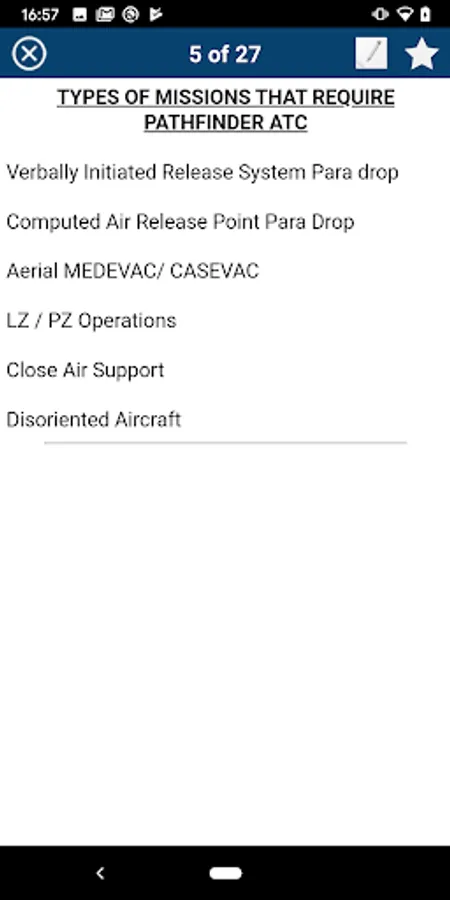 NOTE: This is NOT the official US Army Pathfinder School app. Please download the official app too. It contains some basic administrative information not found in this app. This app is specifically designed as a study aid for Pathfinder School. It's a tough school. Every study aid will help.
