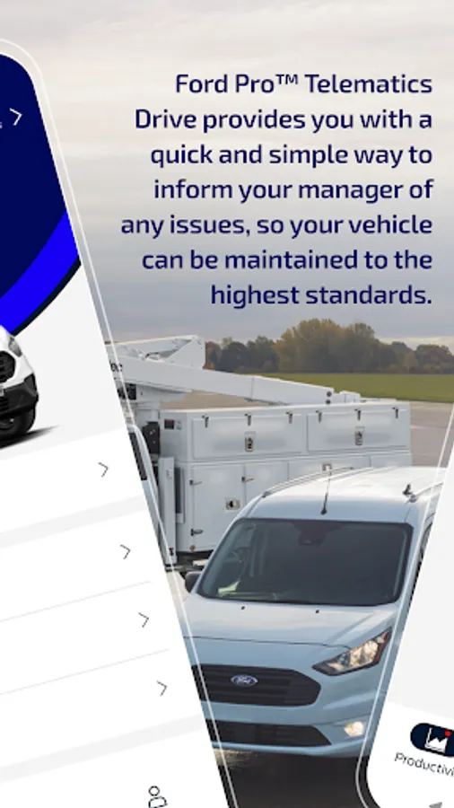 As a busy driver of a company fleet vehicle, having a well-maintained vehicle is critical to ensuring you can complete your jobs on time. Ford Pro Telematics™ Drive is designed to help you do just that. By providing you with a quick and simple way to inform your manager of any issues, your vehicle can be maintained to the highest standards.