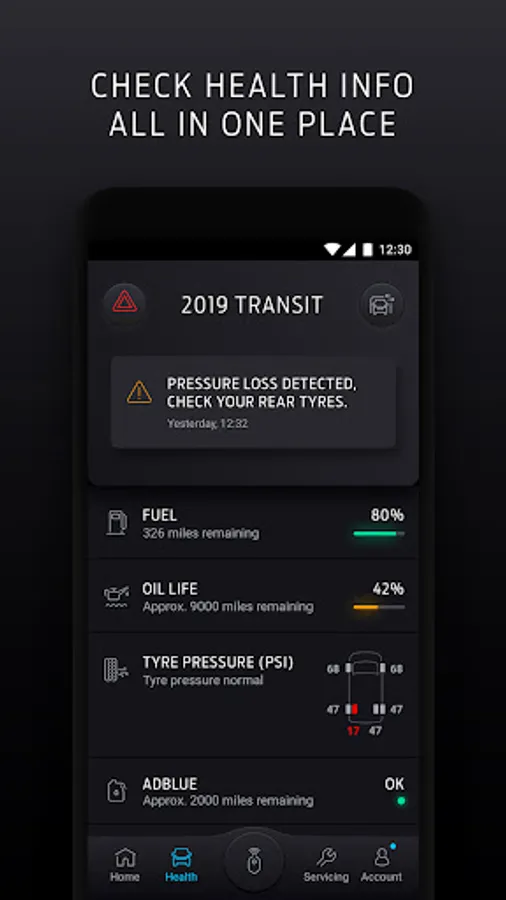 - Vehicle health status – oil level, tyre pressures, AdBlue condition