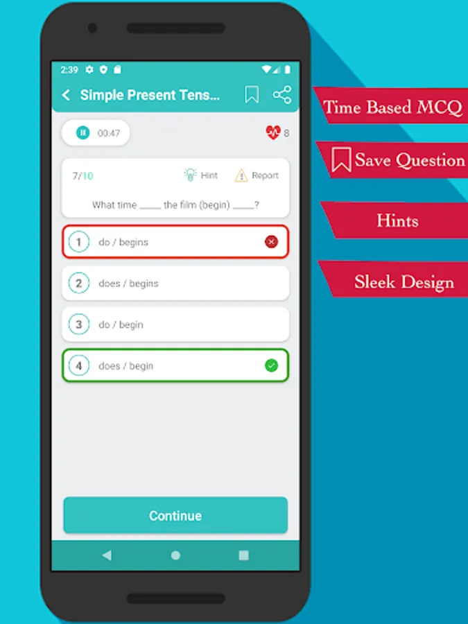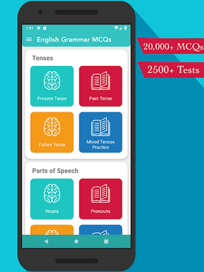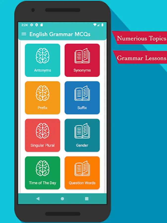 Every English grammar topic and test is covered. Such as present tense, past tense, future tense, nouns, pronouns, adjectives, adverbs, prepositions, conjunctions, interjections, quantifiers, gerunds & infinitives, are also included. We have covered almost every English Grammar topic, and we will add more topics and tests to the app every month.