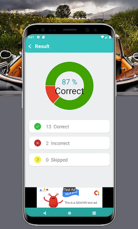 • View your test results after completion of each test. You should attain 80% or above to pass the DMV test.