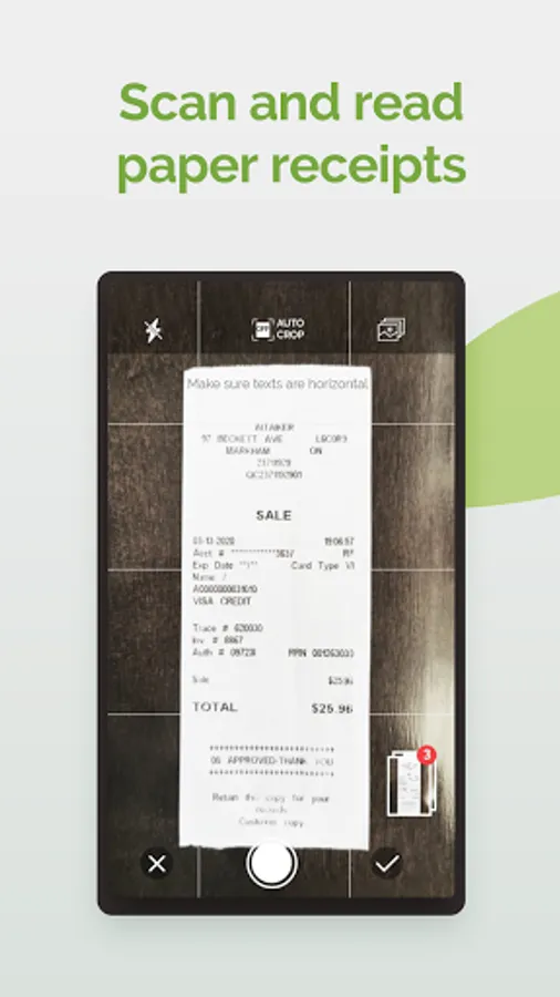 To scan your receipts and bills using Foreceipt, simply tap the scan icon at the bottom. Place your phone above the receipt on a plain, dark background. Foreceipt uses OCR technology to accurately read the merchant and payment data to convert your paper bills & receipts into digital receipts. You can edit, verify or delete your receipts once scanned. Foreceipt is the most convenient expense tracker available.