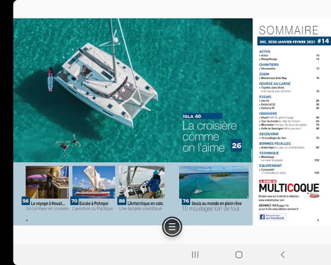 Le Monde du Multihull is a quarterly magazine that highlights exceptional catamarans and trimarans. The boats are tested over time. The practical aspects of maneuvering and life on board thoroughly inspected. Dream destinations (Polynesia, Seychelles, etc.) are in the spotlight, both for hire and for long cruises.
