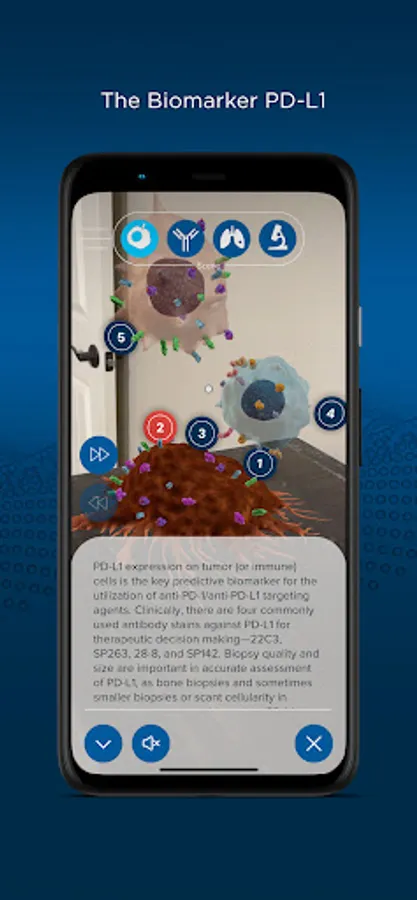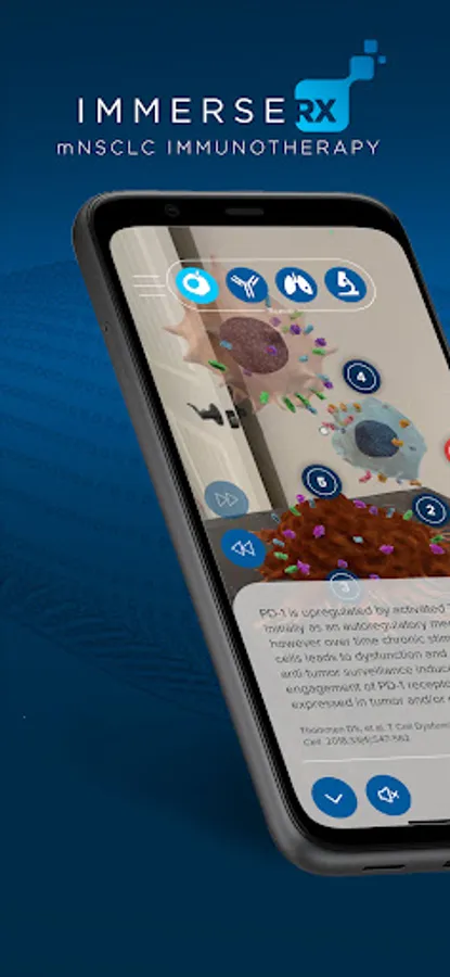 Powered by Forefront Collaborative, ImmerseRx mNSCLC Immunotherapy is an interactive learning tool that explores tumor immune evasion pathways in metastatic non-small cell lung cancer (mNSCLC), such as the programmed cell death protein 1 (PD-1)/programmed death-ligand 1 (PD-L1) pathway, and how immunotherapy targets these pathways to lead to tumor cell death. Moving through four interactive scenes, users will also learn about biomarker testing that is necessary to inform treatment decisions around immunotherapy for mNSCLC.