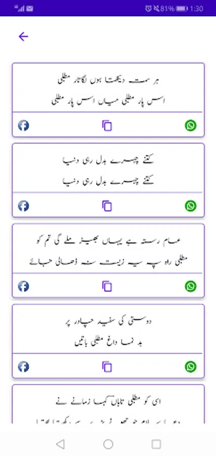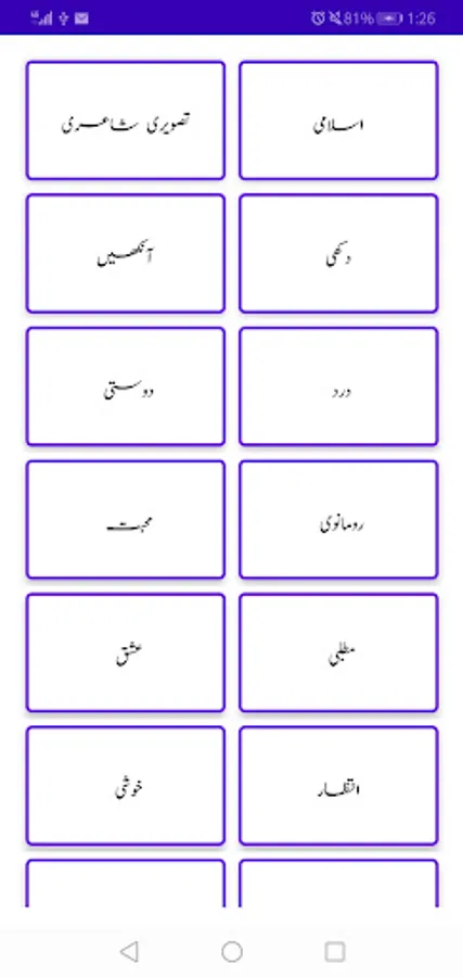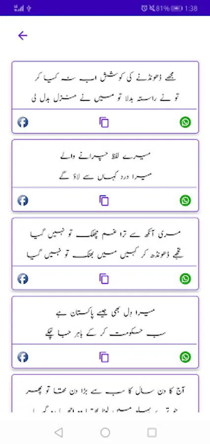 it also contain the collection of different poet and categories, like friendship poetry, husband, wife angry poetry. The content of this app is original Urdu in the from of image these type of images can be share on what's app status and also on Facebook and Instagram etc