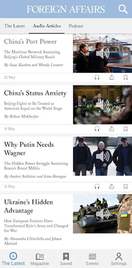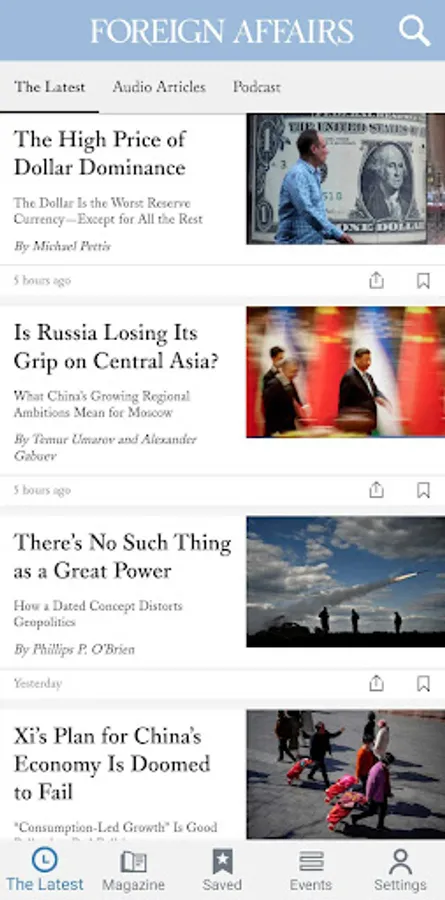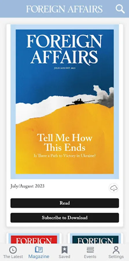 Download the Foreign Affairs app to stay up-to-date on the latest international news, commentary, and policy analysis from influential thinkers and world leaders. Foreign Affairs offers insightful articles, digital issues, podcast episodes, videos, and audio content on critical topics related to geopolitics, security, economics, science and technology, climate change, and more. Foreign Affairs has published globally renowned thinkers and world leaders over the past 100 years from around the world and across the political spectrum, including W. E. B. Du Bois, Eleanor Roosevelt, George Kennan, Madeleine Albright, Henry Kissinger, Nelson Mandela, Hillary Rodham Clinton, Barack Obama, Jill Lepore, Eric Schmidt, Samantha Power, Fareed Zakaria, and more. Get new, relevant articles on international topics of interest daily. Subscribers get additional access to digital magazine issues. Podcasts and event videos are free for all users.