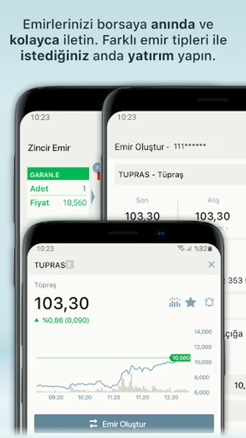 TEB YATIRIM PRIME adapts to your user habits with its customizable interface. You can change the general appearance of your application with the day and night theme, and you can manage both your notification and order sending and research report preferences from the settings area. You can easily follow the market data with watch lists and send your orders at the market price practically with quick order buttons.