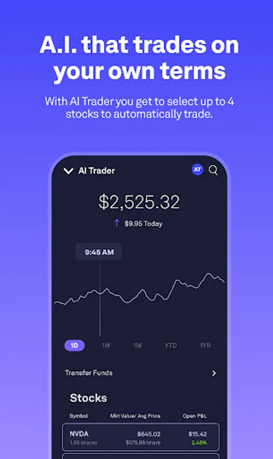 Upgrade to get access to the AI Trader which allows you to automate trading with your favorite stocks. Select up to four stocks and AI Trader will automatically buy and sell them based on advanced AI algorithms.