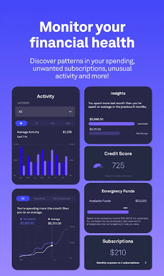 Your personal finance dashboard gives you a holistic view of your assets and liabilities, credit score, net worth and more. With intelligent insights you identify patterns in your spending habits, get alerted on unusual expenses and automatically see what subscriptions you’re paying for. Easily connect your external accounts and take control of your financial situation today.