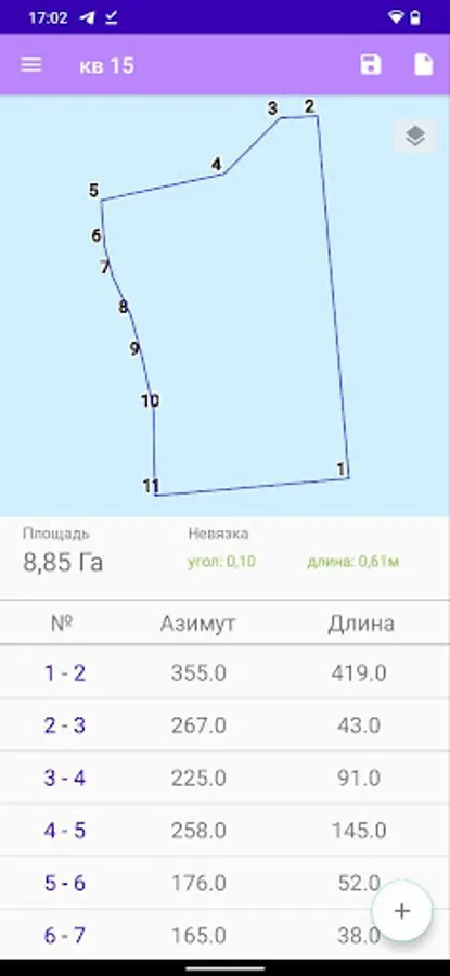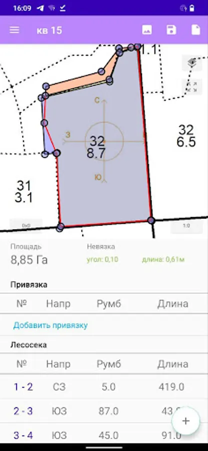 - a catalog with the numbers of characteristic points (pillars) at the corners of the cutting area (object), the distance between them (length of lines, m), magnetic azimuths (points) of lines (direction of lines)