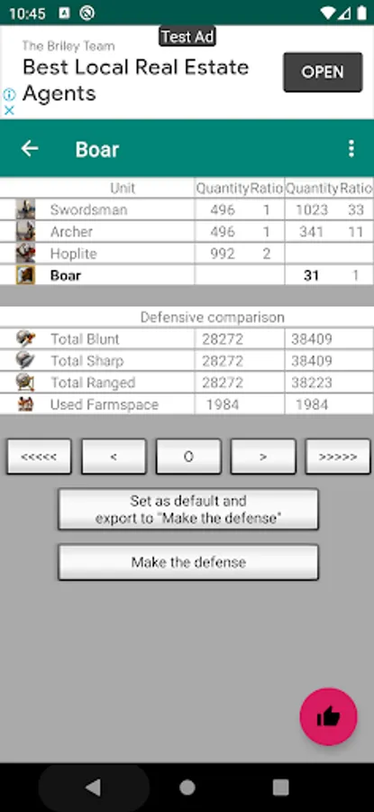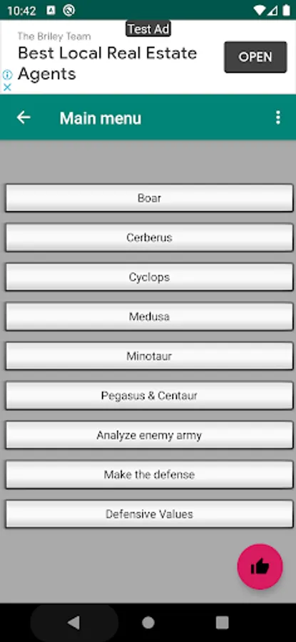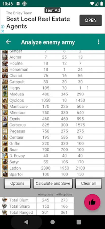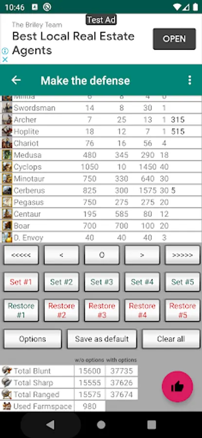 The application contains the optimal proportions of the ratio of units to build a balanced defense using mythical creatures.
