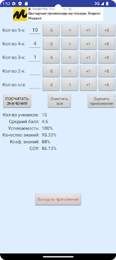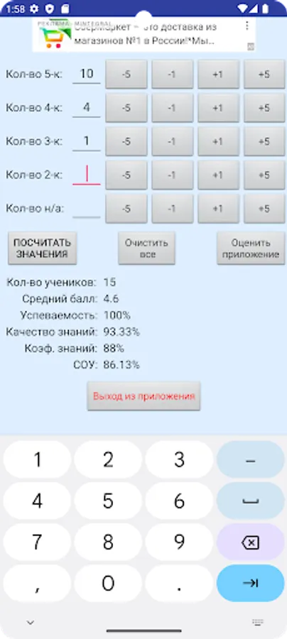 The Achievement and Learning Calculator (ZUN) will help calculate academic achievement, the quality of knowledge, SDA (student's degree of learning) and the average score in the class or on the stream. It is useful for teachers, class teachers and head teachers for summing up the results of a quarter, half a year, a year without calculating these parameters on a calculator.