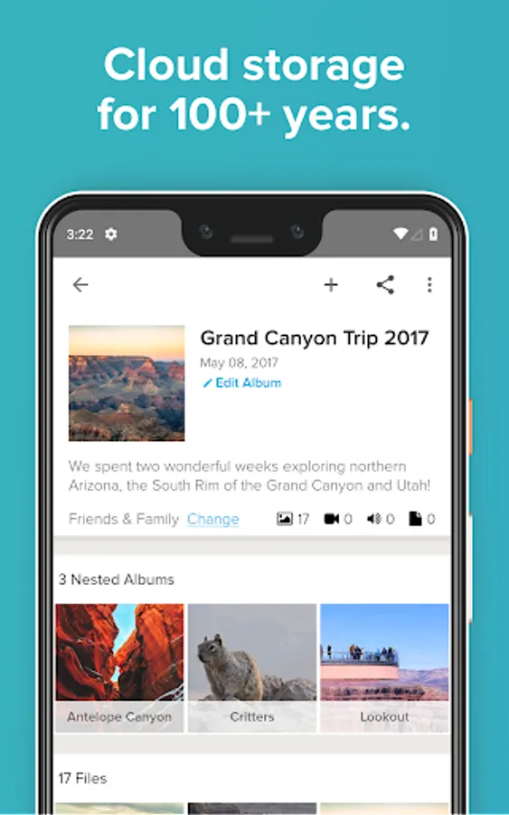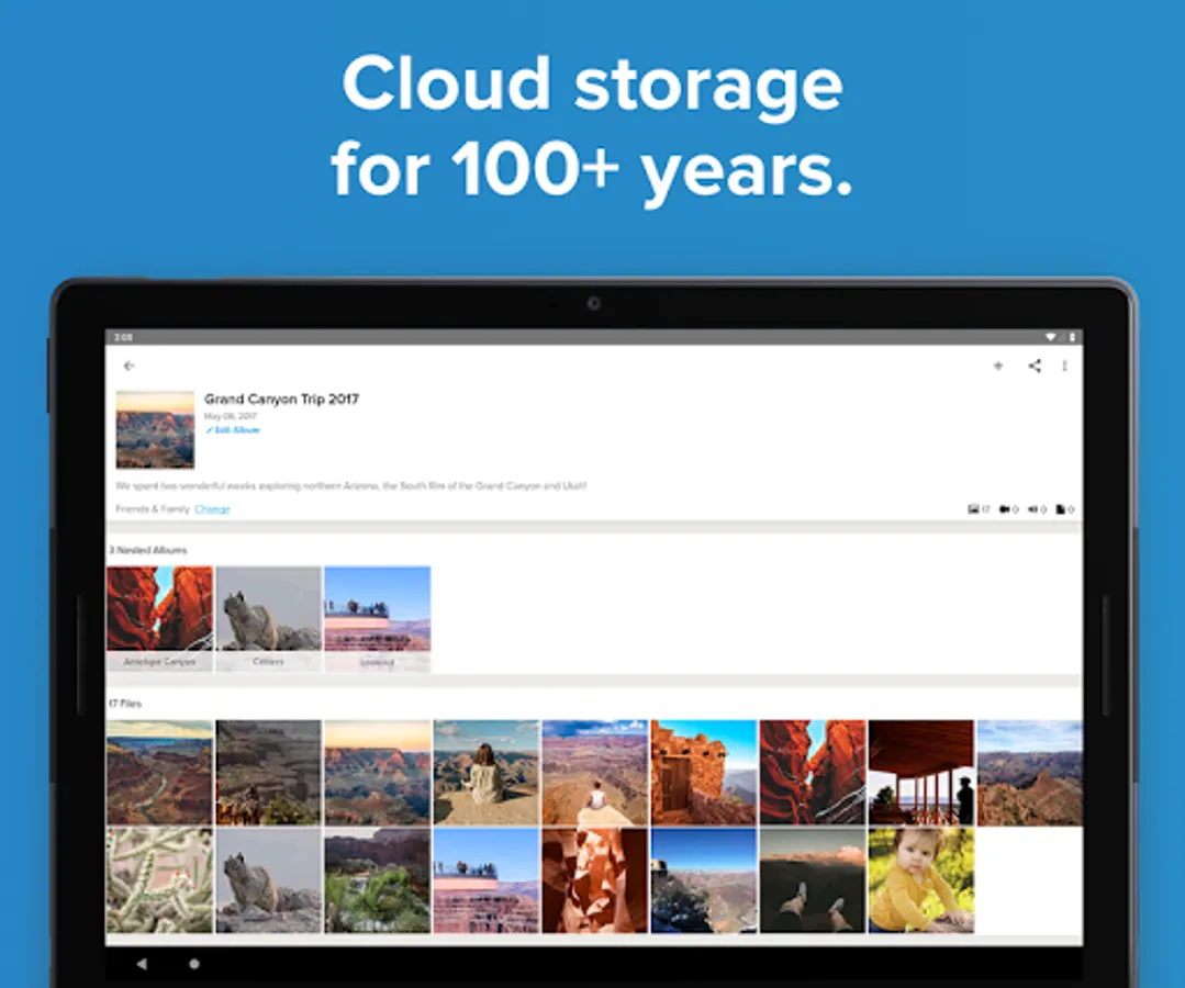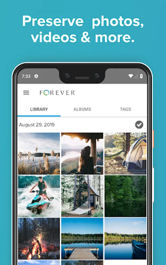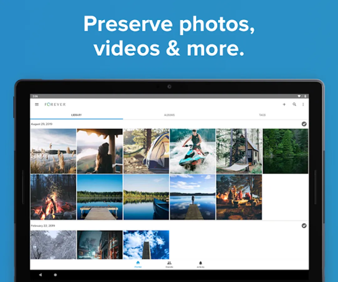 FOREVER is the world's only memory-keeping service that guarantees secure, permanent storage of your photos, videos, audio files, and documents for your lifetime plus 100 years. The FOREVER Android App makes it easy to save, organize, and share your memories on your terms. You own all of your content, we will never mine or sell your data. With our guarantee, along with automatic upgrading of all your files to industry standards over time, you can finally rest easy knowing that your memories will be securely passed down for generations.