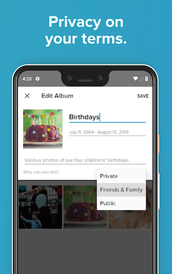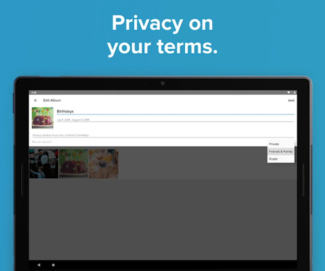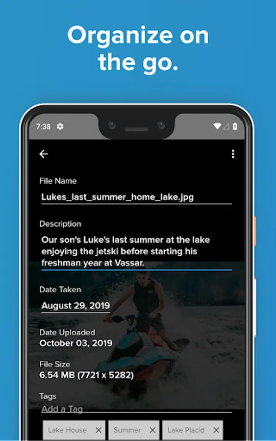 • Easily organize: Quickly tag, date, sort, and create albums on the go. We offer a variety of organizational tools to match different styles.