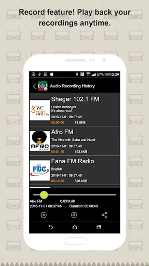 Enjoy the app anytime. Ethiopia Radio offers different radio channels in Ethiopia to users. You can easily find and listen to the broadcast anytime anywhere. Choose and Click to Listen brings you the convenience app experience.