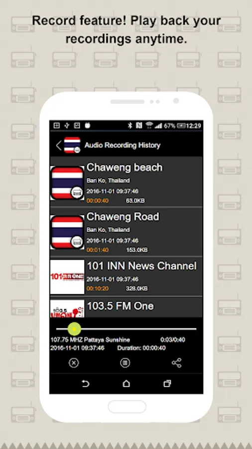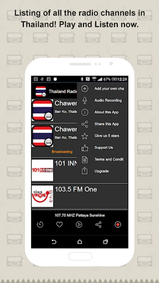 Enjoy the app anytime. Thailand Radio offers different radio channels in Thailand to users. You can easily find and listen to the broadcast anytime anywhere. Choose and Click to Listen brings you the convenience app experience.