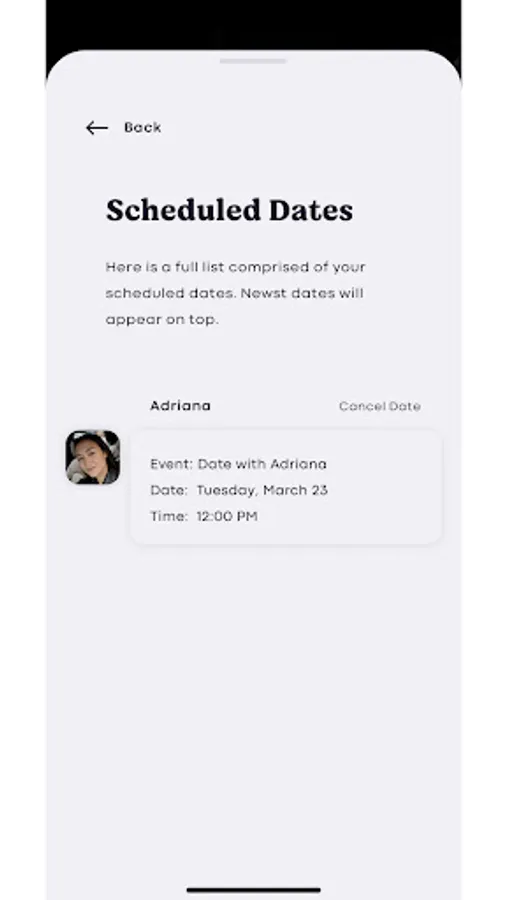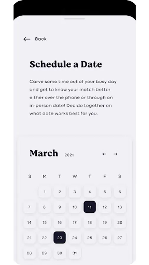 Industry-first, “Schedule a Date” interactive feature which provides matched users the option to schedule a date, showing preferred days and times in one clean, easy-to-use screen