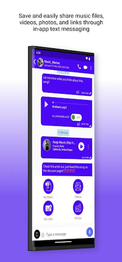 The sayeYO app provides an opportunity for music artists to securely store their song and video files in one place and easily share their songs, photos, and videos through fully encrypted in-app text messaging or through external communications platforms like email or social media.