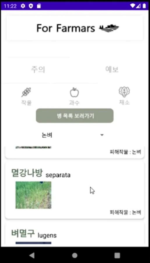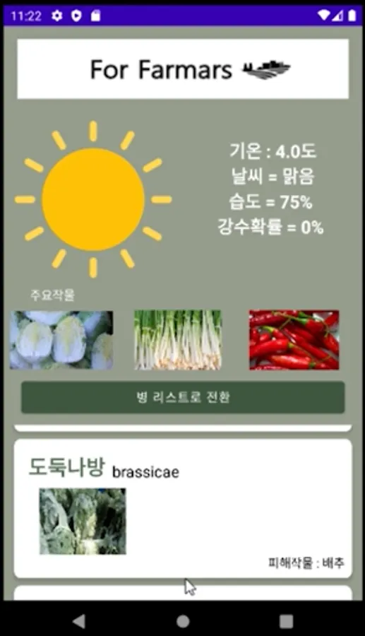 농가가 위치한 지역의 날씨 정보와 해당 지역의 주요 작물, 그에 따라 발생할 수 있는 병해충 정보를 알려주는 농부들을 위한 애플리케이션입니다.