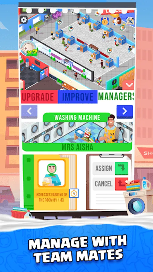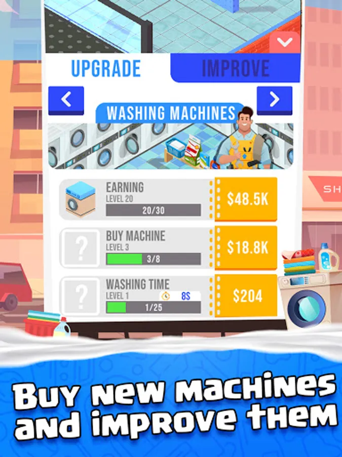You start with a washing room then build dry room, ironing room, dry-cleaning room etc. Buy new machines and improve them, you can also decorate the room by buying furniture and goods.