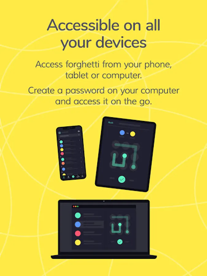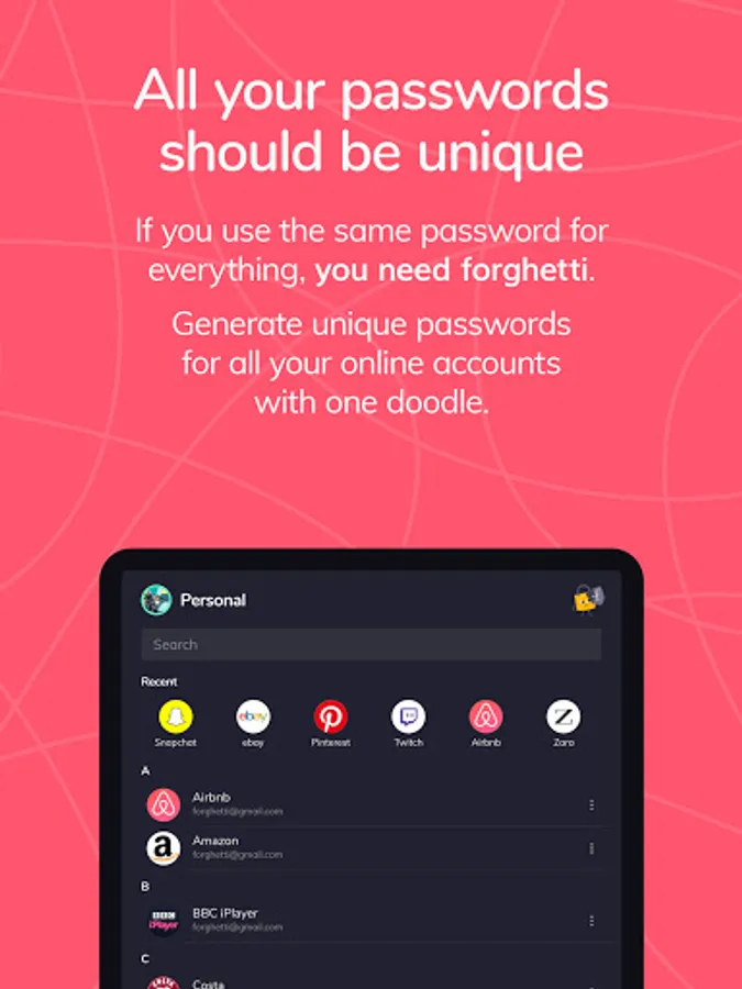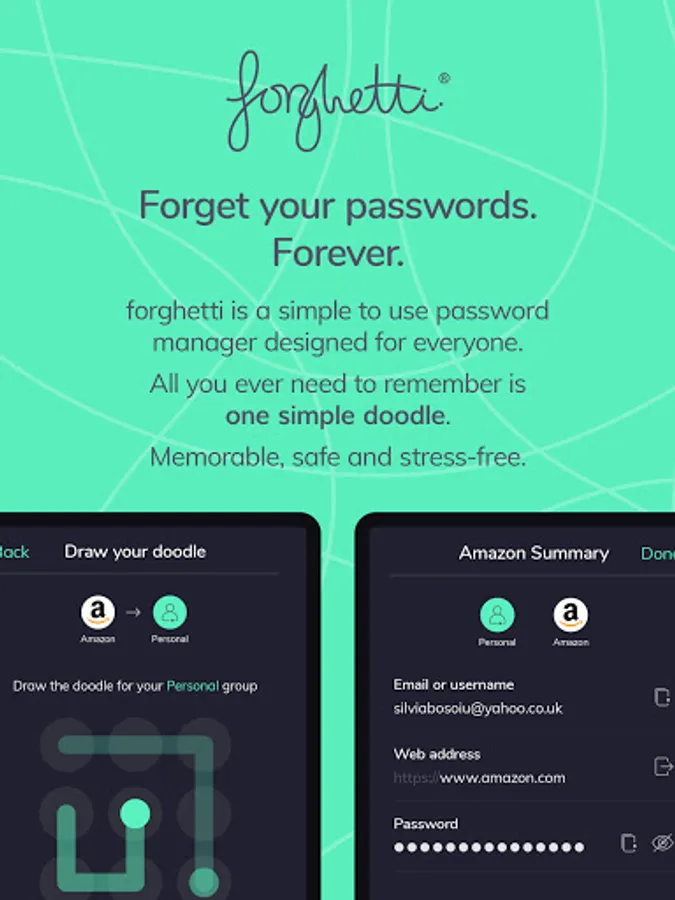forghetti is a simple to use password manager designed for everyone. All you need to remember is one simple doodle. Memorable, safe and stress-free. Unlike other password managers, we do not save a database of passwords. We generate them when you need them. They are calculated using your doodle as the key. Super safe and only known by you.