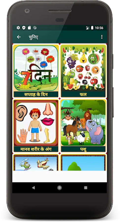 Various section like Hindi varnamala(हिंदी वर्णमाला), Games for kids.