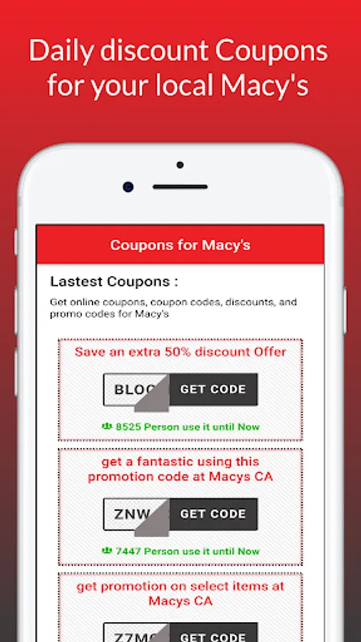 Instantly save on your shopping with 'Coupons for macy's'. Easily find Coupons for macy's to get great discount codes and special deals. Why pay more? Why pay regular price? Start shopping wisely with Coupons for macy's today. Within this app, you will find all Coupons for macy's in less than a minute.