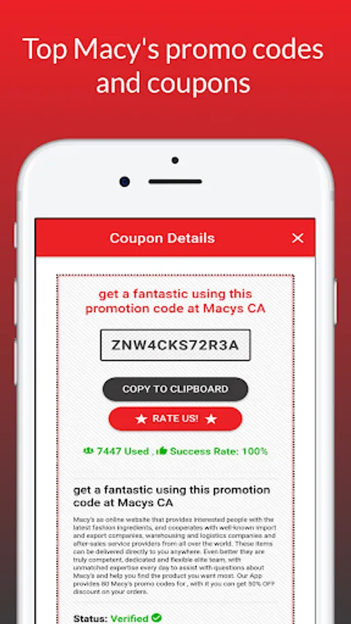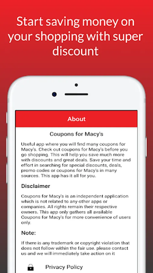 Coupons for macy's is an independent application which is not related to any other apps or companies. All rights remain their respective owners. This app only gathers all available Coupons for macy's for more convenience of users only.