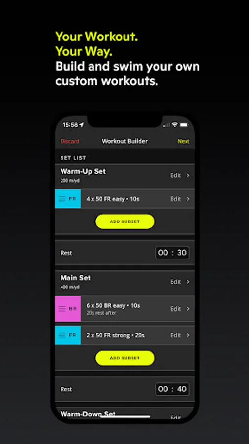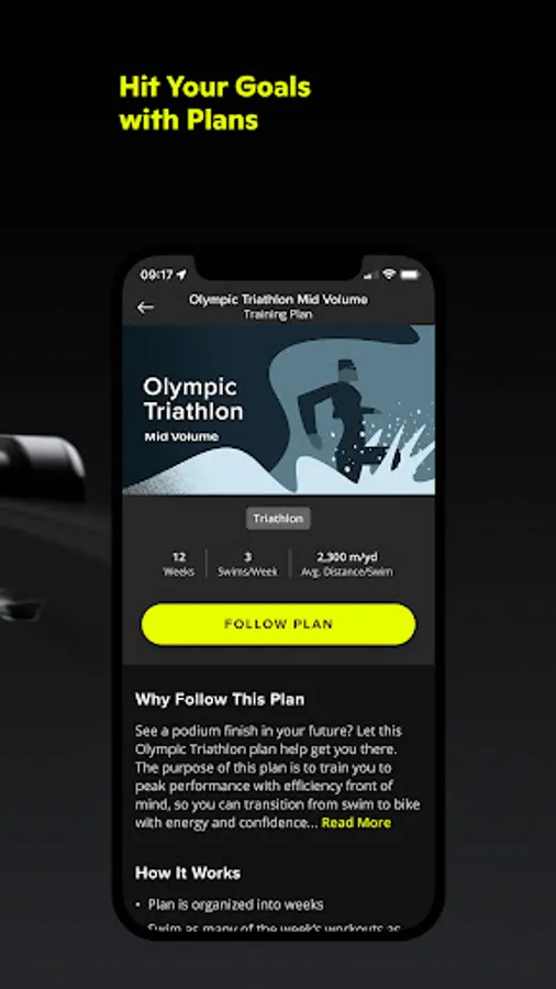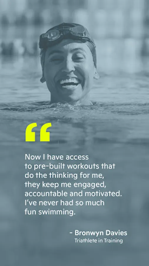 1. ALL YOUR SWIM TRAINING. Choose between Plans and Workouts based on your swim goals. Work through a Plan structured to help you improve your swimming skills or swim an individual guided workout. You can also load your own workouts through our custom workout builder.