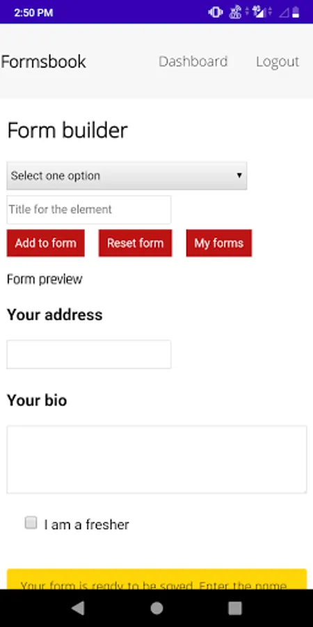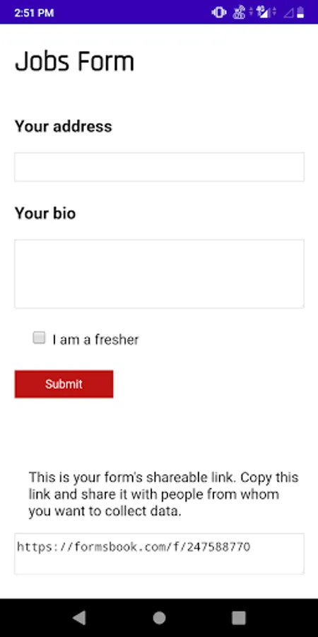 FormsBook is an application with which you can create various types of shareable forms within a few seconds/minutes without writing a single line of code. Once your form is ready, all you have to do is share the form's short URL with people from whom you want to collect data. You can share the URL anywhere you like. For example, you can create a contact information form, registration form, etc with FormsBook and share the form URL with your friend via an SMS/email. Once the user fills the form and submits it, you'll receive a notification email. FormsBook doesn't have annoying popups, floating windows, or tons of options. It is fast and simple.
