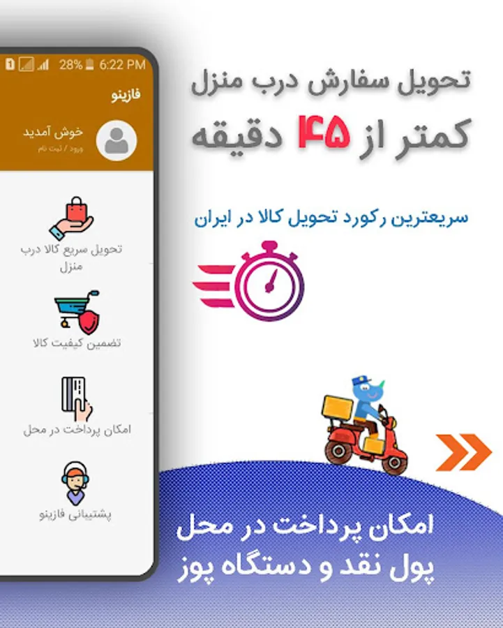 # ** تحویل سفارش کمتر از 45 دقیقه ( سریع ترین رکورد سیستم ارسال کالا در ایران )
