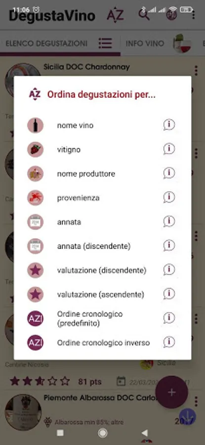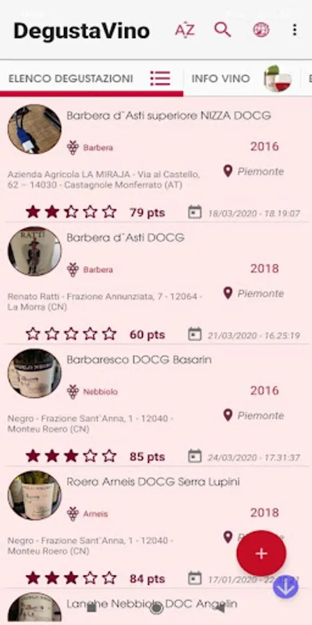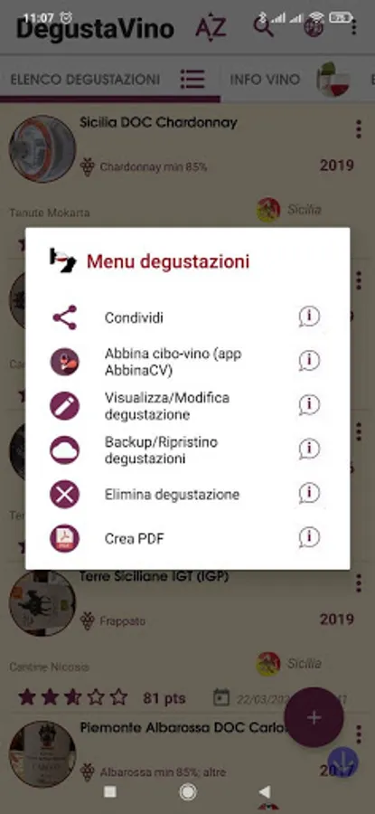 - Quick scrolling of the list of tastings through the database of Italian denominations and from version 1.8.0 also of the main (over 200) French denominations (AOP-AOC)