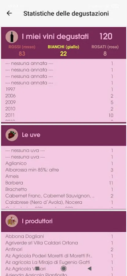 - Statistics on wines tasted (vintages, grapes, producers and origins)