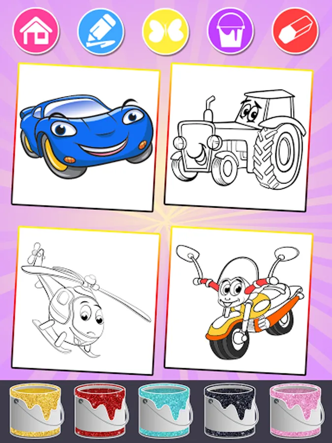 Cars Coloring is game full of vehicles. Color the Cars Coloring on your phone or tablet in this virtual coloring game and painting book. It so easy that even toddler can play, paint & draw. This coloring game where children and adults can color vehicles. Both, boys and girls will love this coloring game. In this coloring game you can find many types of vehicles such as monster truck, racing car, fire engine, bulldozer, tractor, motorcycle, bicycle, aircraft and train.