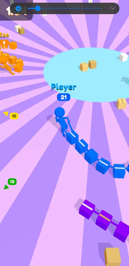 Pick up boxes to make a train of boxes behind you. Make sure not to run into anyone else's train of boxes - and don't run into your own either!