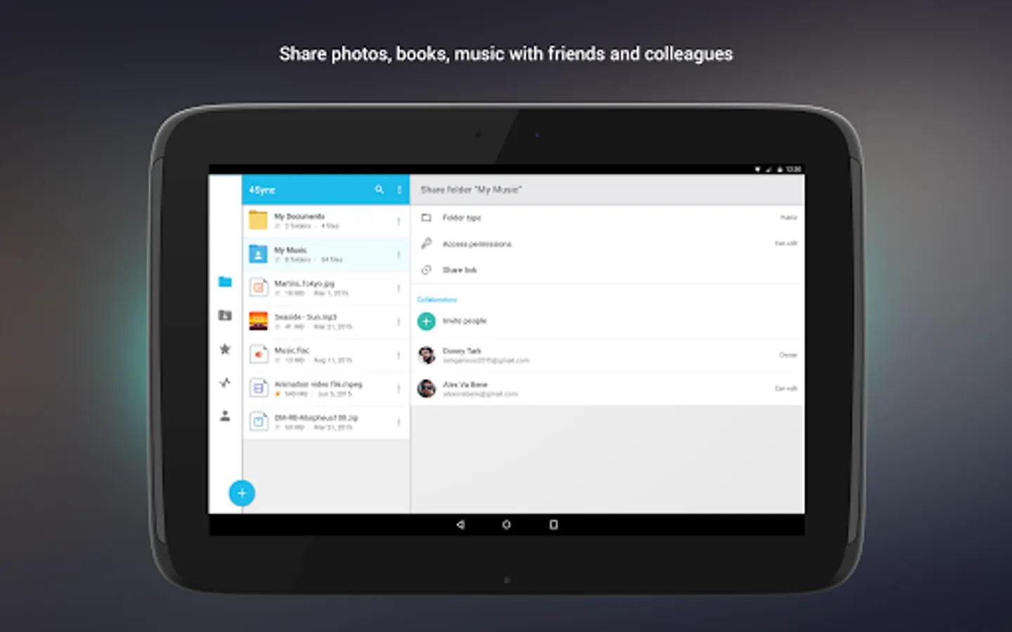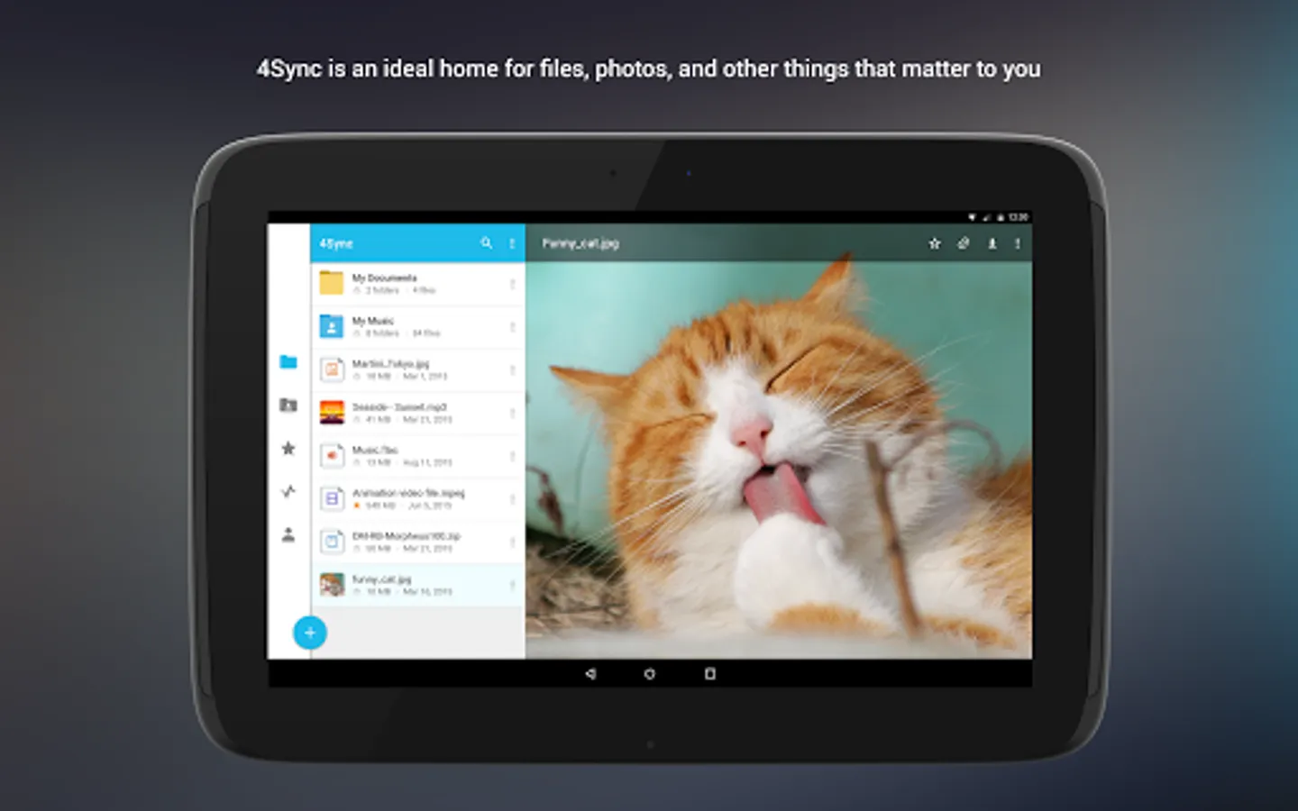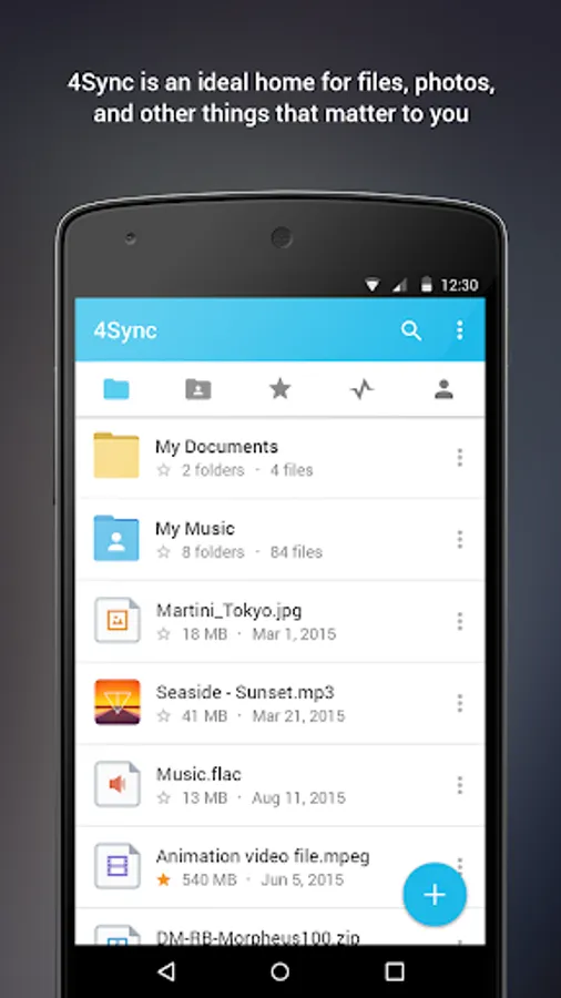 With 4Sync for Android it only takes a few clicks to upload, sync and download any files from your account at 4sync.com on your smartphone or tablet and further share them with your family, friends and colleagues.