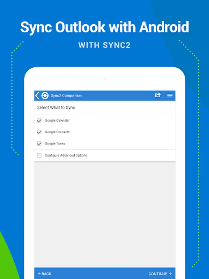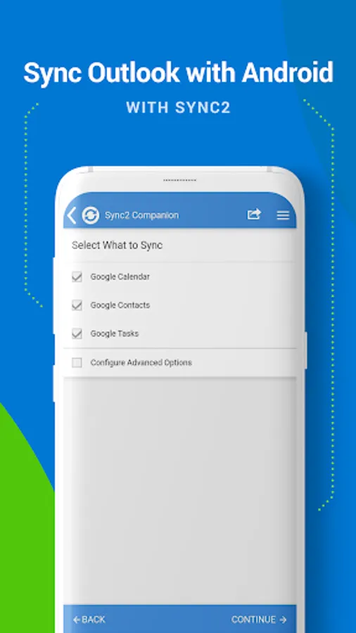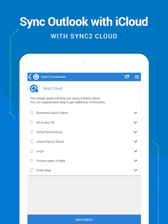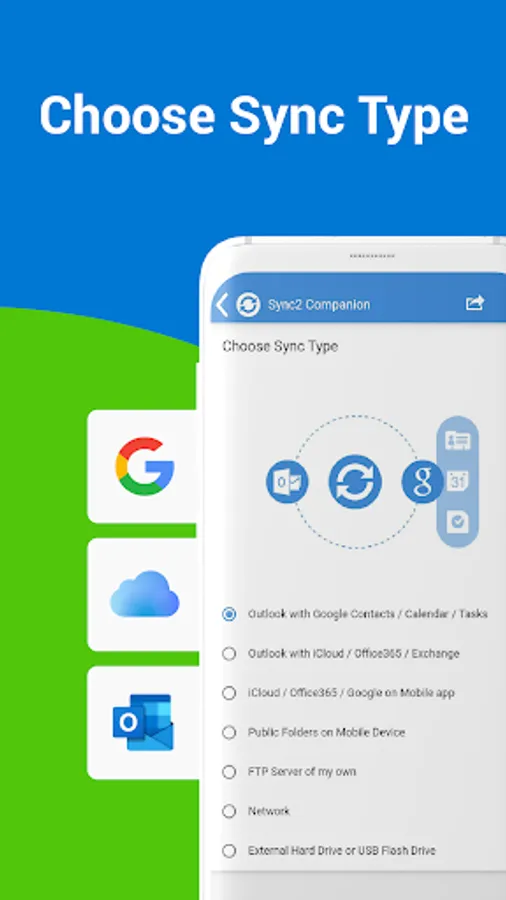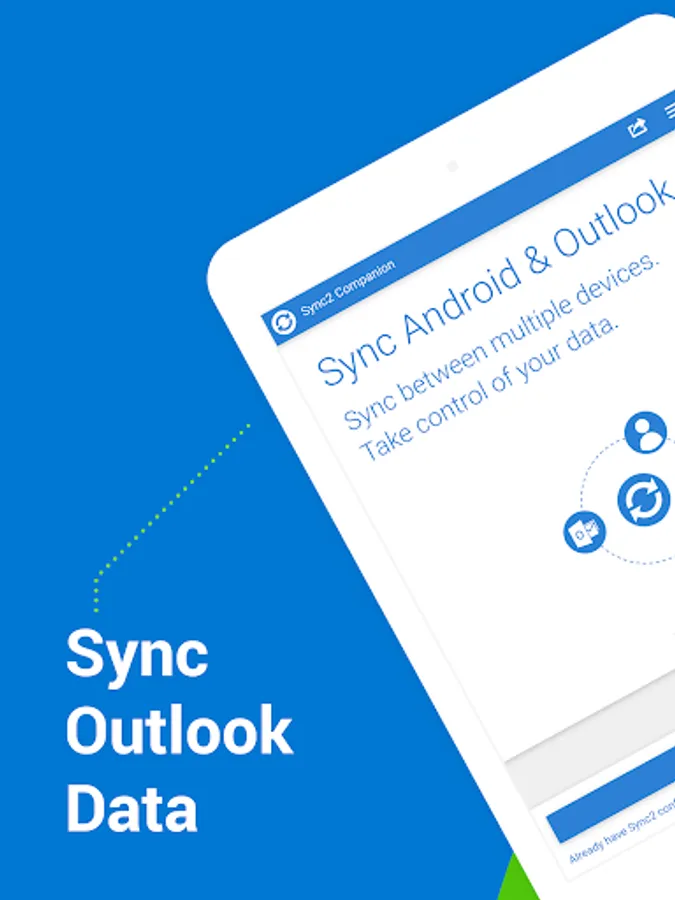 This is a Complimentary Companion that helps you set up synchronization for Outlook with Google, Office 365, Exchange, iCloud and Android, iPhone, iPad sync with iCloud and other cloud services. Sync2 Companion will go through all the necessary settings to set up synchronization.