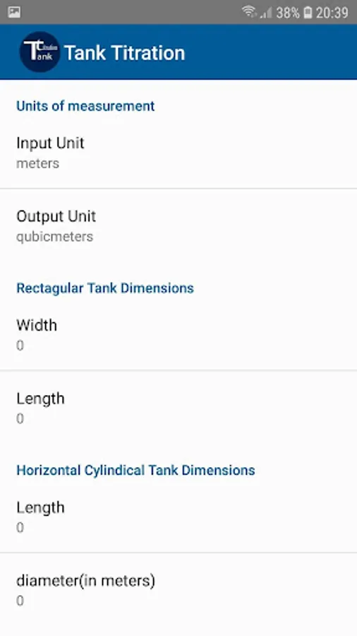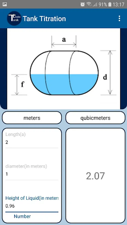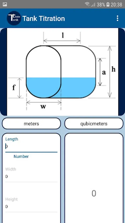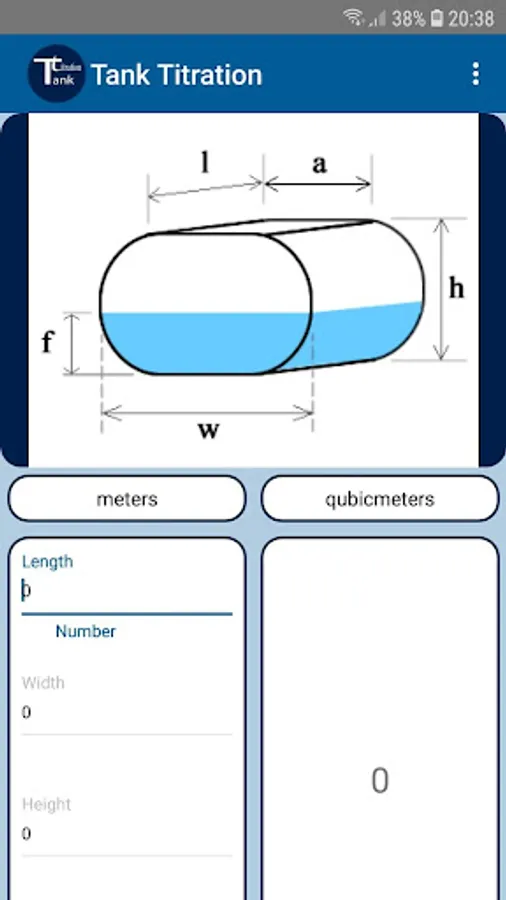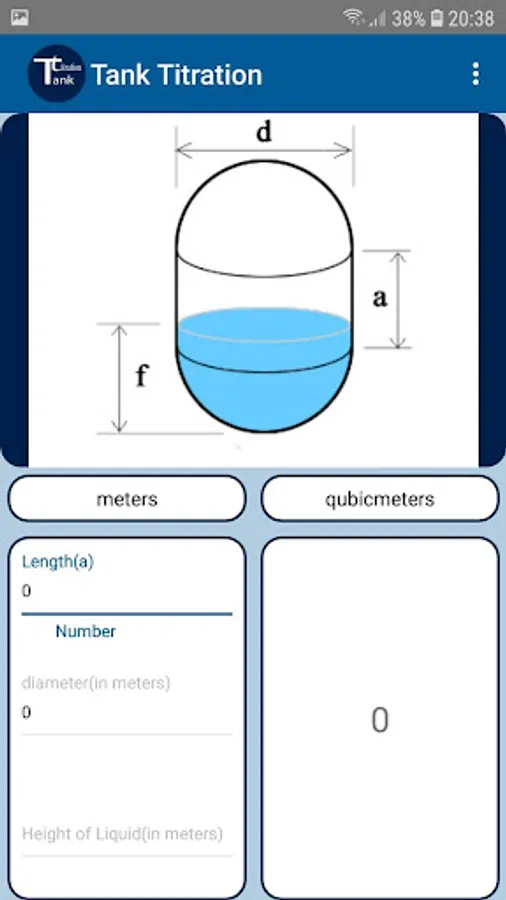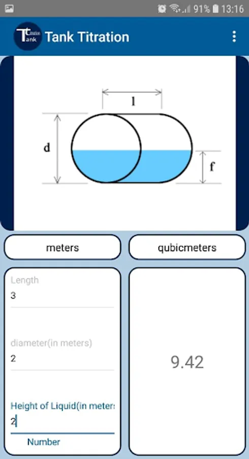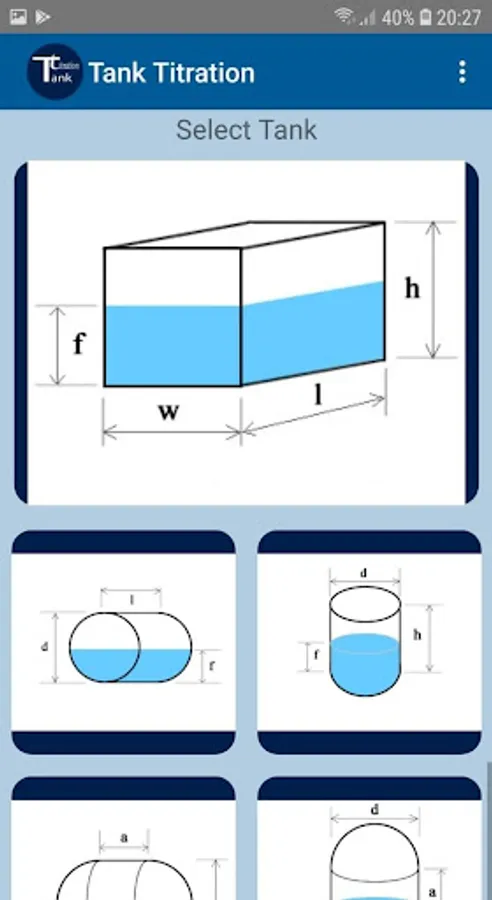 It is an application for calculating the volume of home tanks. Choose the type of tank and then you set the dimensions and height of the fluid level.