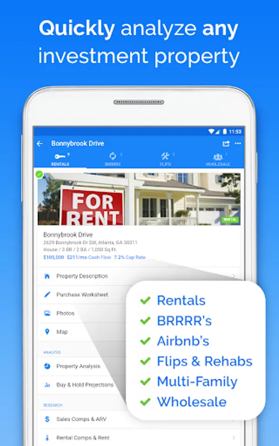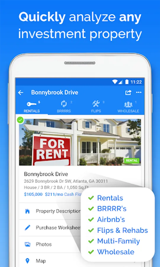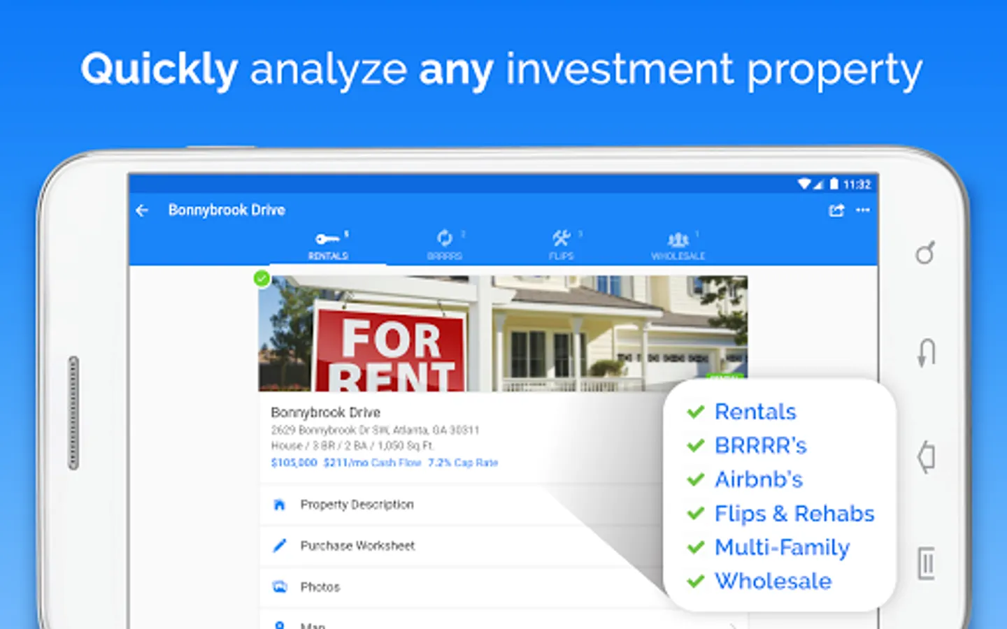 • Analyze single-family, multi-family and commercial rentals, BRRRR's (buy, rehab, rent, refinance, repeat), Airbnb's, house flips and wholesale deals