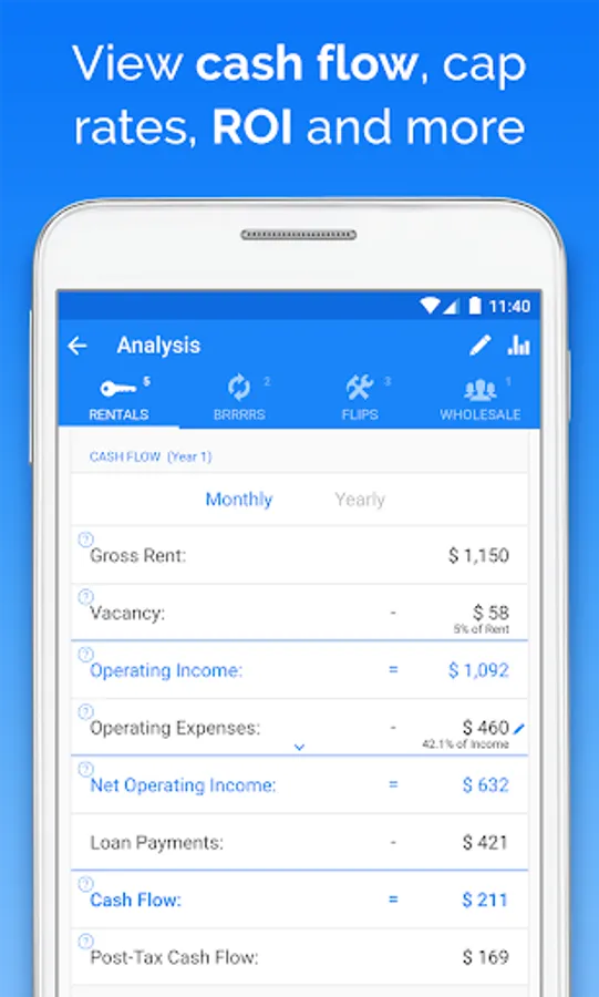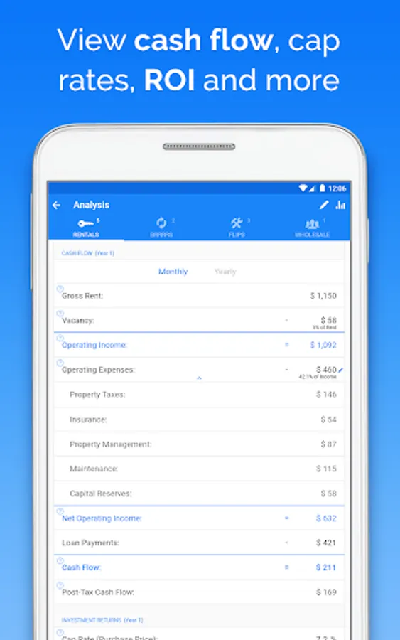 Quickly import property data from public records or enter it through a step-by-step wizard. Our app will calculate a complete analysis of the deal, including closing costs, mortgage payment, cash flow, ROI, profit and more.